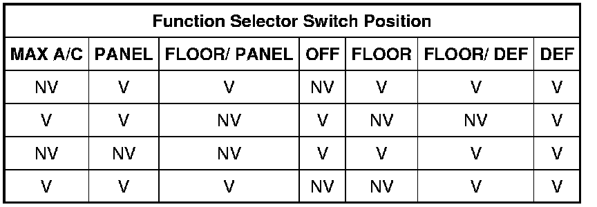 Connect a vacuum pump to the function selector switch vacuum supply port and try to pull a vacuum in each function selector switch positions. Follow the chart below, to determine which positions should and should not hold vacuum. If the vacuum pump can pull and hold a vacuum when the chart indicates no vacuum (NV), the switch is plugged. If the vacuum pump does not pull and hold a vacuum when the chart indicates vacuum (V), the switch leaks.