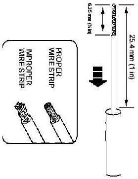 2. Strip 6.35mm (1/4 in) of insulation from each wire end, taking care not to nick or cut wire strands.