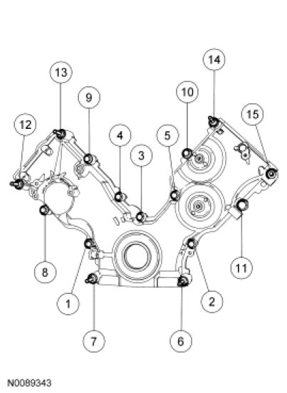 Tighten the 15 engine front cover fasteners in the sequence shown to