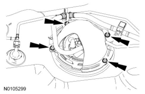 4. If equipped, remove the 4 fuel pump module cover nuts and remove the fuel pump module cover.