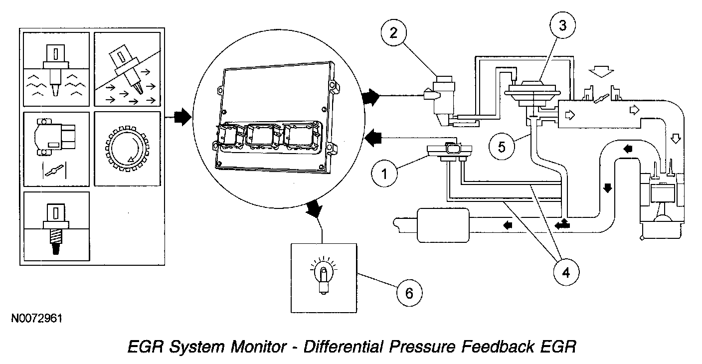 5. The EGR flow rate test is carried out during a steady state when the engine speed and load are moderate and the EGR vacuum regulator duty cycle is high. The monitor compares the actual differential pressure feedback EGR circuit voltage to a desired EGR flow voltage for that state to determine if the EGR flow rate is acceptable or insufficient. This is a system test and may trigger a DTC for any concern causing the EGR system to not operate correctly.