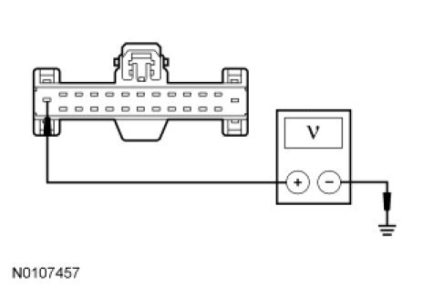 - Measure the voltage between the RETM C2949a-13, circuit SBP14 (BN/RD), harness side and ground.