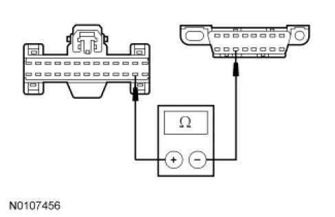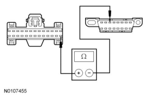 - Measure the resistance between the RETM C2949b-15, circuit VDB07 (VT/OG), harness side and the DLC C251-11, circuit VDB07 (VT/OG), harness side.