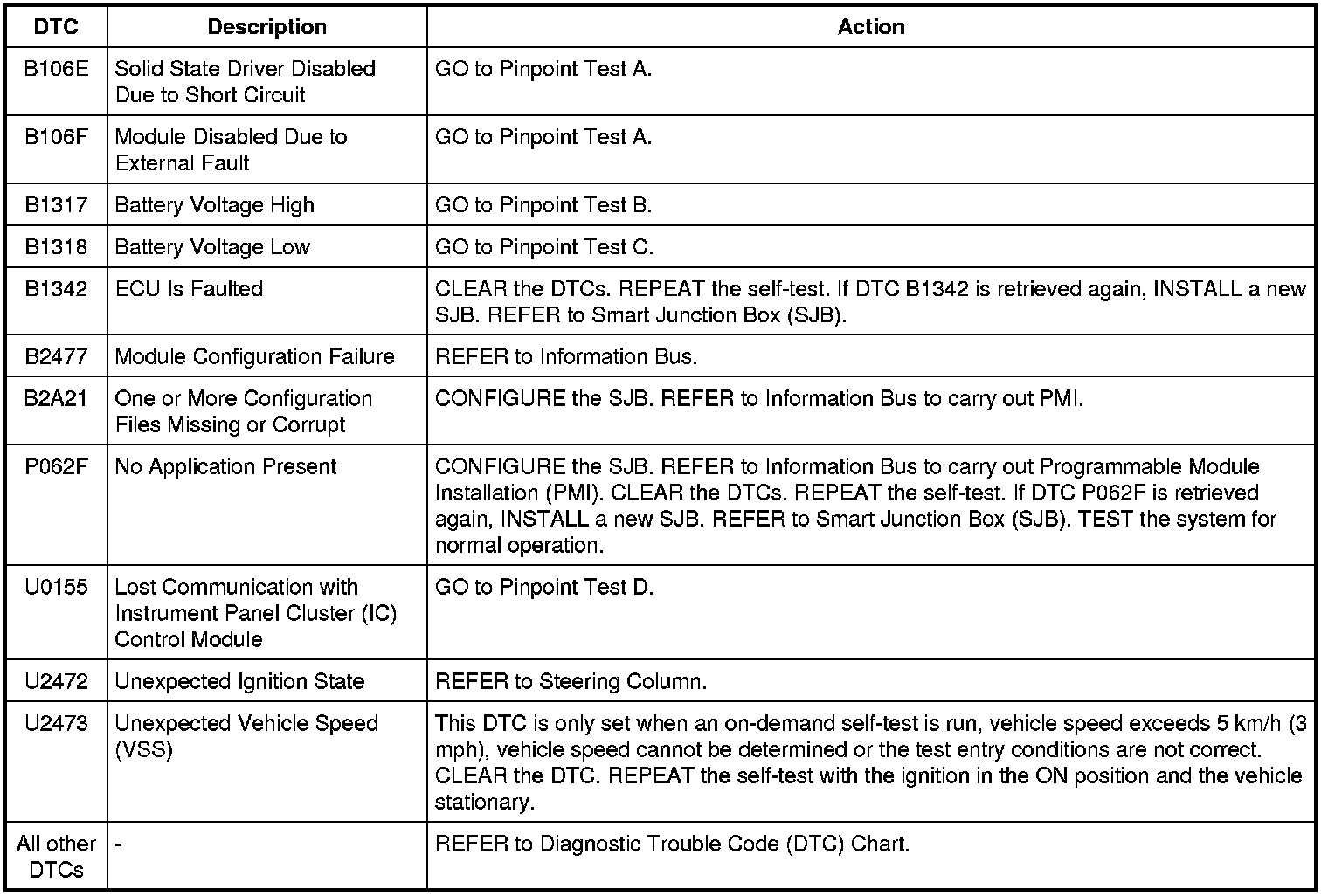 Smart Junction Box (SJB) DTC Chart