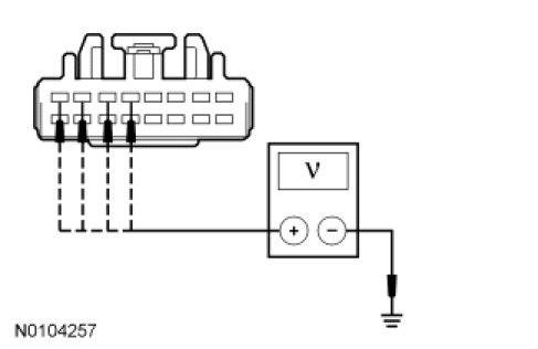 - Measure the voltage between the audio DSP module, harness side and ground as follows: