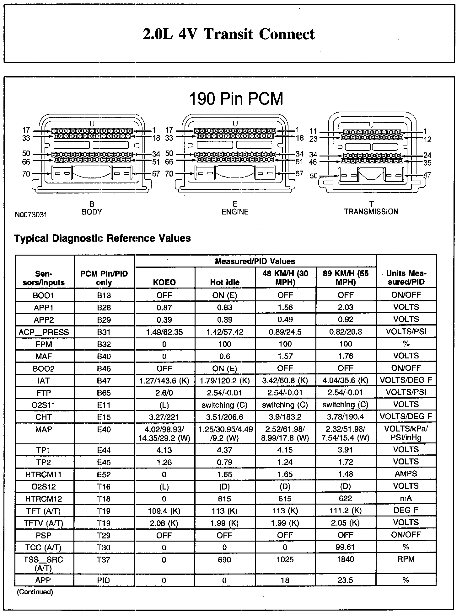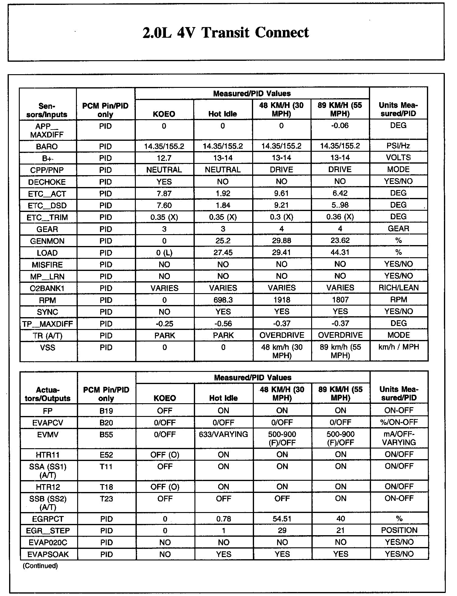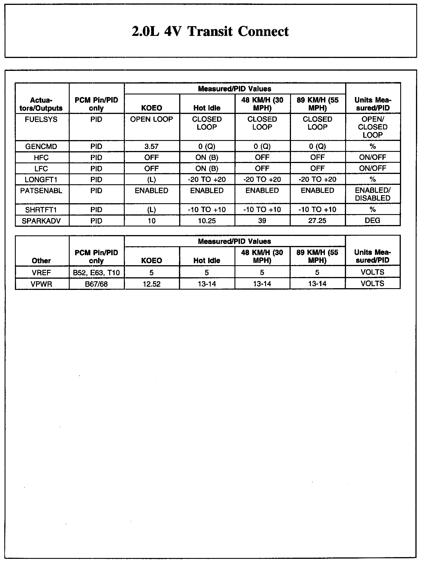 The Typical Diagnostic Reference Value Charts do not display fault parameter identifications (PIDs). These are PIDs which indicate a hard fault with the circuit. They display a value of YES or NO and are PIDs ending with the letter F.