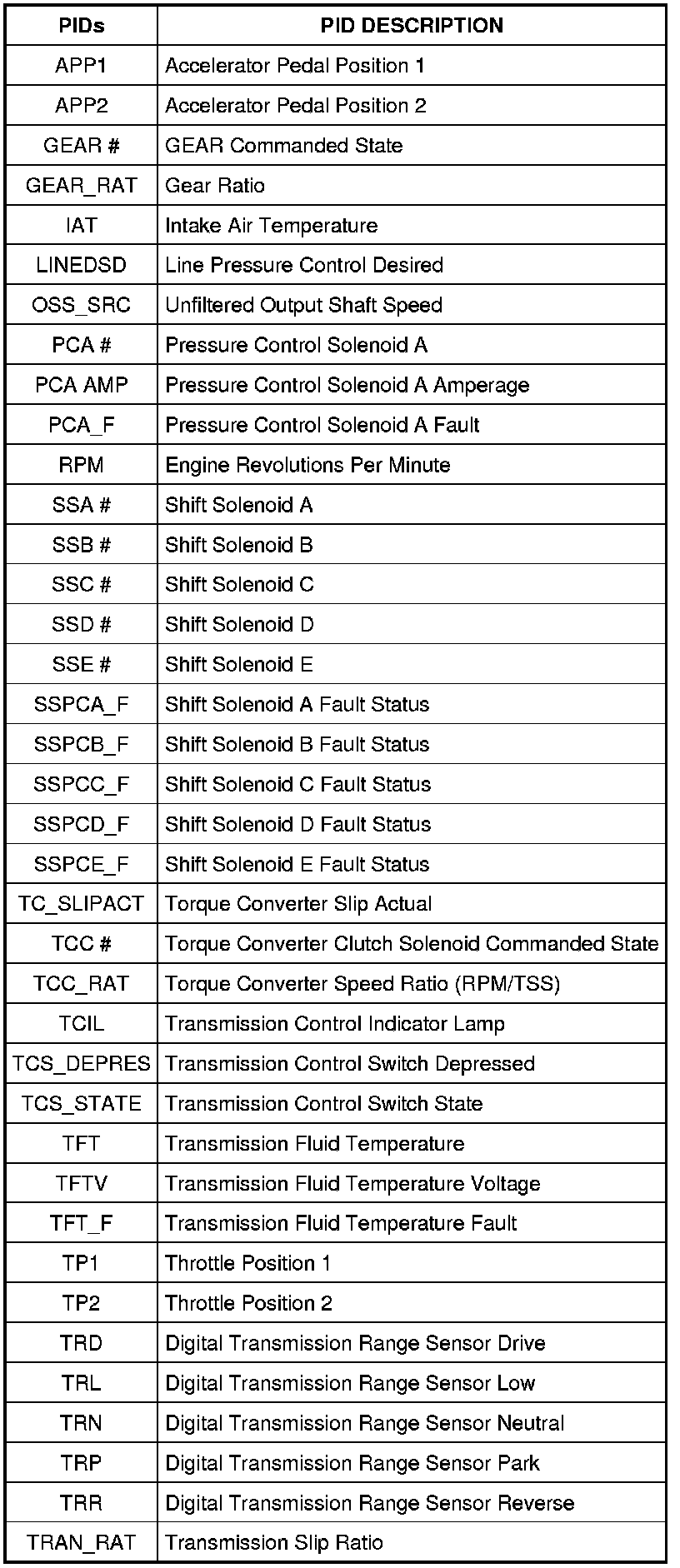 To confirm that the output state control value was sent by the scan tool and the PCM has accepted the output state control substitution, a corresponding PID or PIDs for each output state control parameter should be monitored. Additional PIDs should be monitored to help the technician adequately diagnose the transaxle.