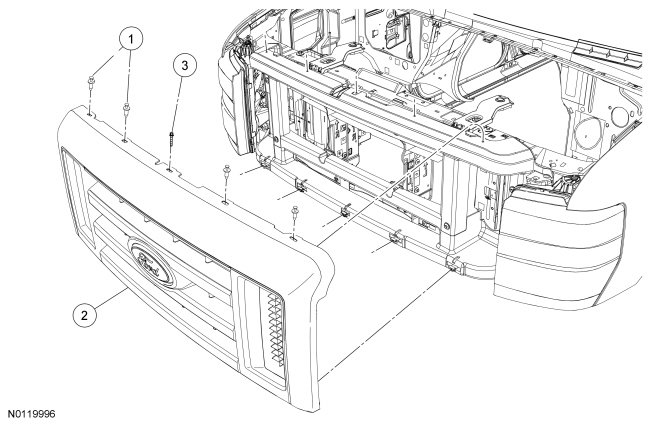 2. Grasp the radiator grille by the lower crossmember and pull forward firmly to disengage the 3 lower clips.