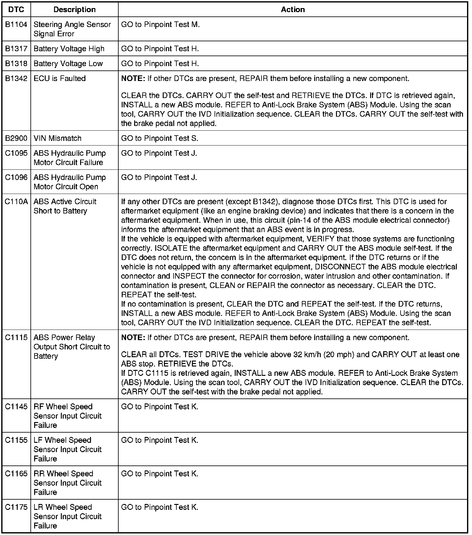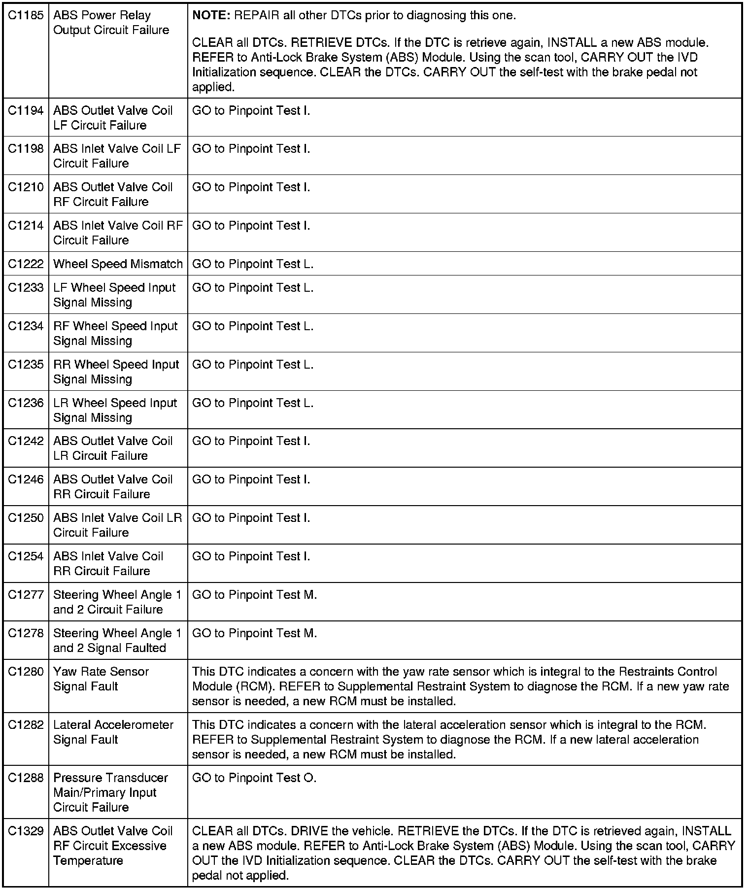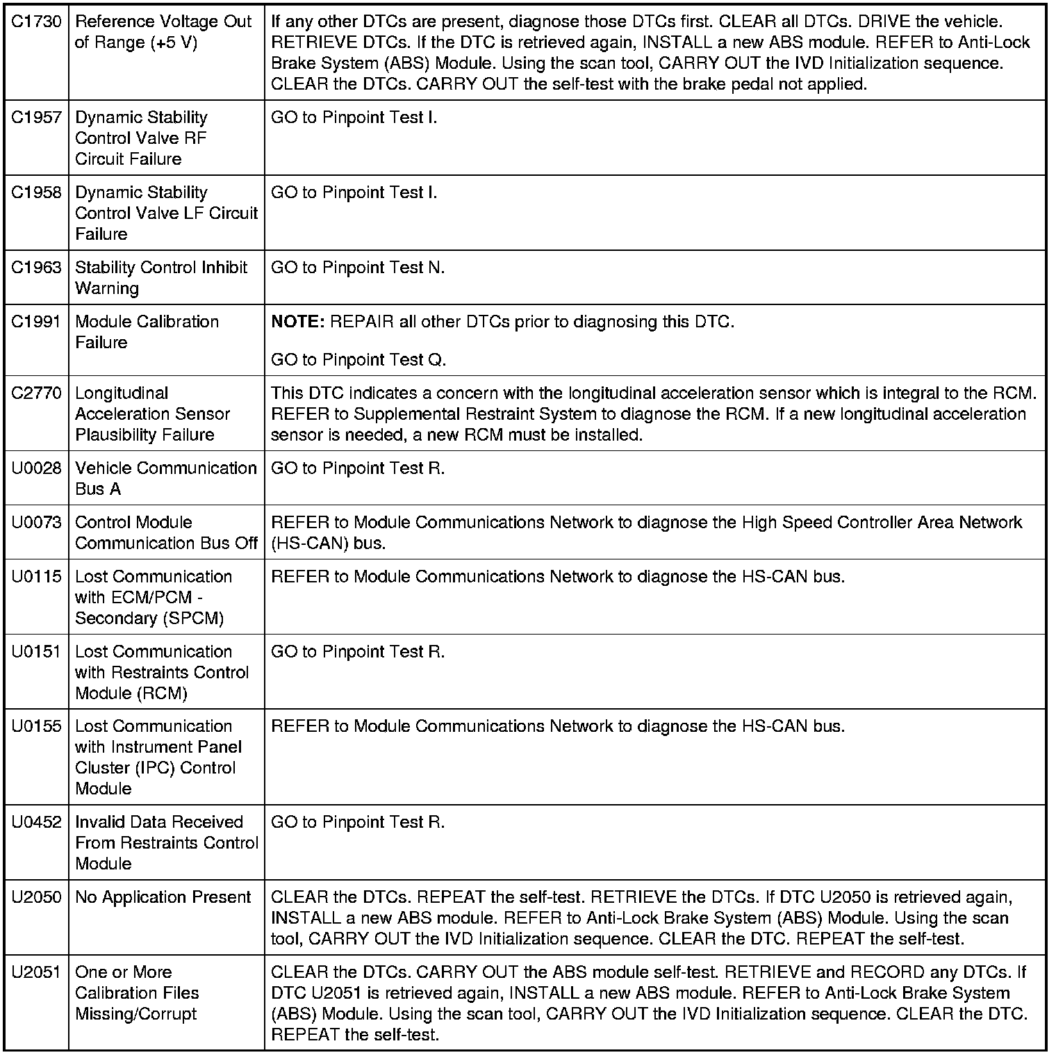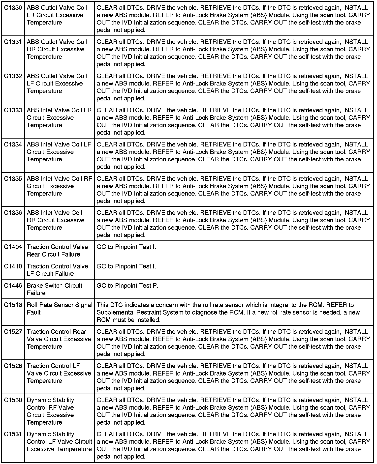NOTE: This DTC chart only applies to vehicles equipped with ABS and Electronic Stability Control (ESC) and/or Roll Stability Control (RSC(R)). It does not apply to vehicles equipped with ABS and Engine Only Traction Control (EOTC). Refer to Inspection and Verification for information on identifying the vehicle brake system. Inspection and Verification