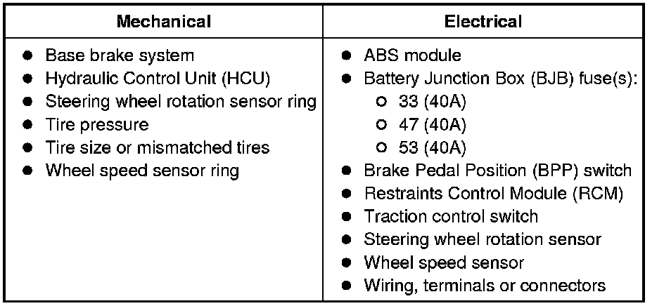 12. If the DTCs retrieved are related to the concern, go to the ABS Module DTC Chart Anti-Lock Control - Traction Control and Stability Assist. For all other DTCs, refer to Multifunction Electronic Modules Testing and Inspection.