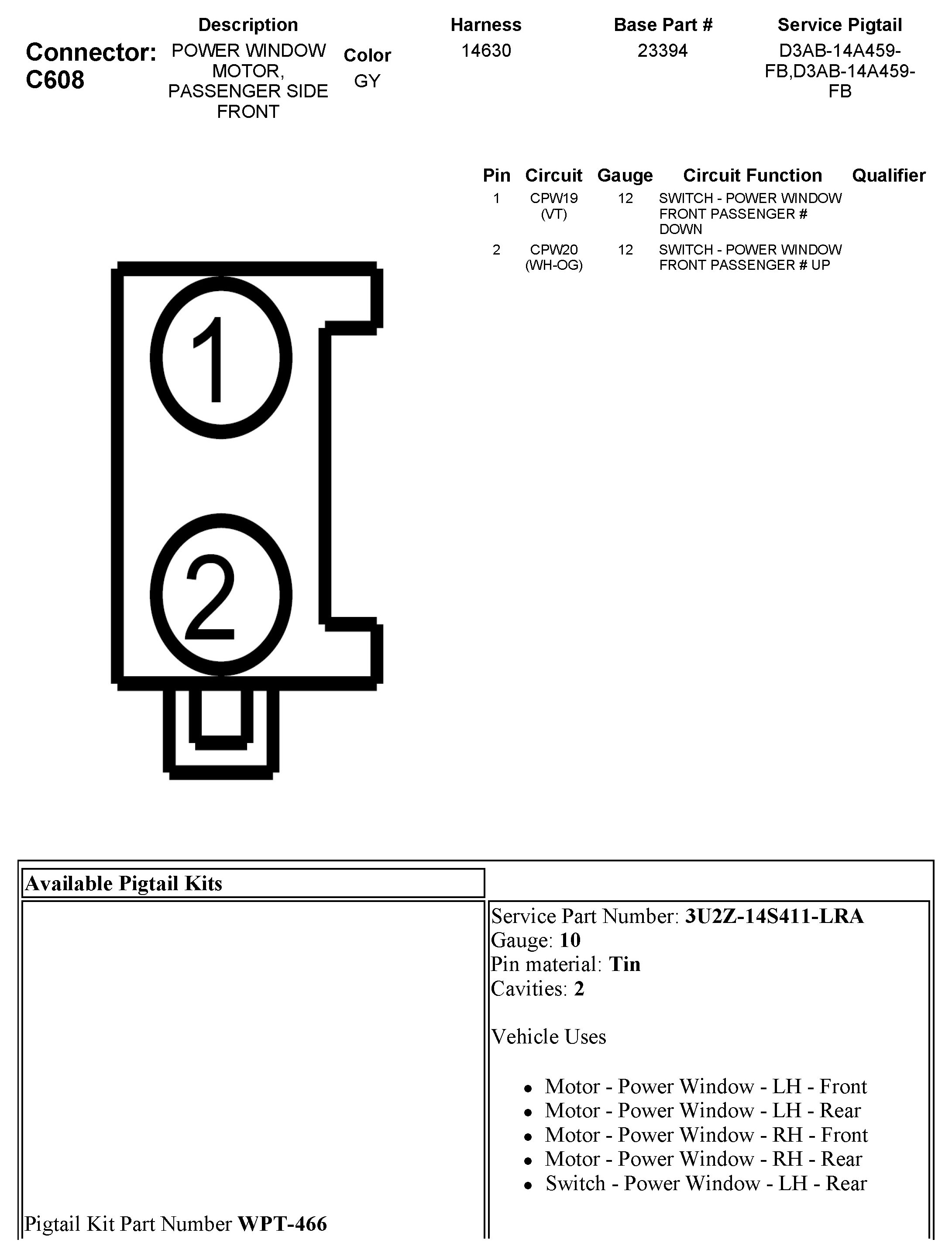 C608 Power Window Motor, Passenger Side Front