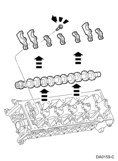 Remove the bolts (17 LH or 15 RH), the 7 bearing caps and the camshaft.