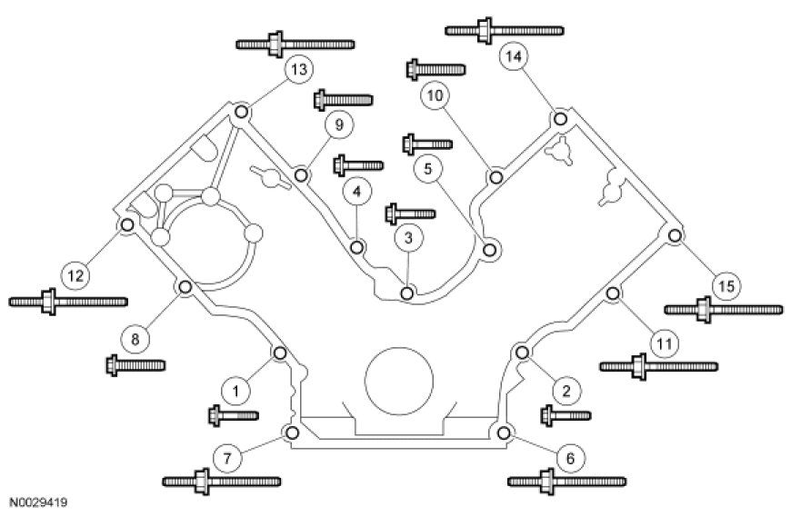 62. Tighten the 15 engine front cover fasteners in sequence in 2 stages.