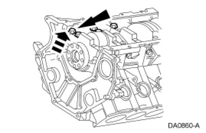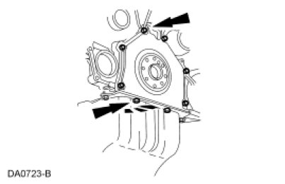 5. Remove the 2 rear oil pan bolts and the 6 crankshaft rear seal retainer plate bolts and the crankshaft rear seal retainer plate.