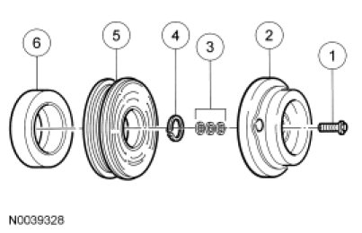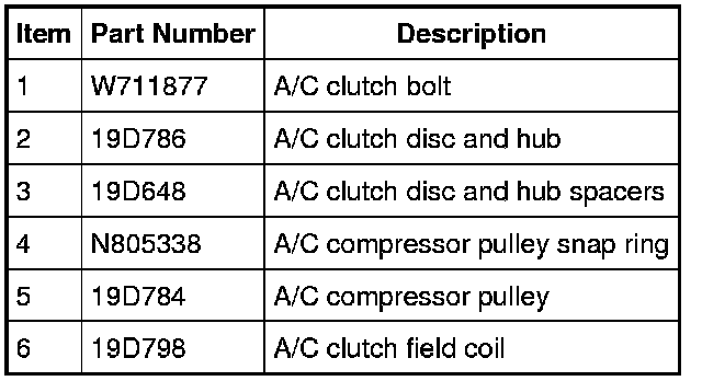 NOTE: Internal FS18 A/C compressor components are not serviced separately. The A/C compressor is serviced only as an assembly. The clutch disc and hub, A/C compressor pulley and bearing and clutch field coil are serviceable.