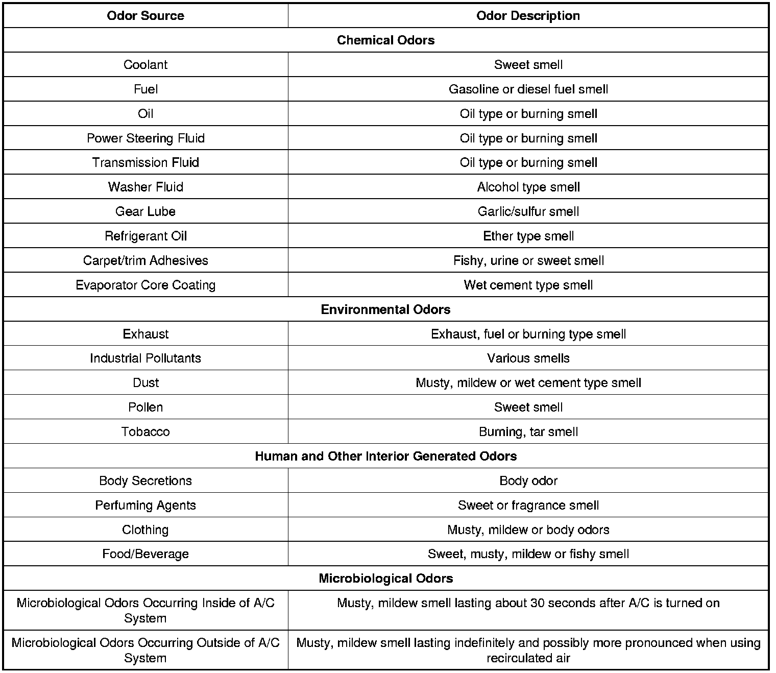 1. Identify the type of odor present in the vehicle. Do not proceed with A/C odor treatment if the odor source is found to be outside of the A/C system. Refer to the following chart for examples.