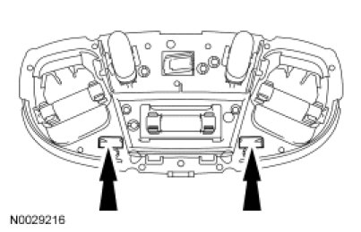 2. Release the 2 retaining clips (through the access holes) and remove the interior lamp from the headliner retainer.