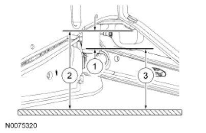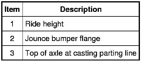 1. Measure the distance between the jounce bumper flange (Item 2) and the top of the axle at the casting parting line (Item 3) to obtain the ride height (Item 1). For additional information, refer to Specifications.