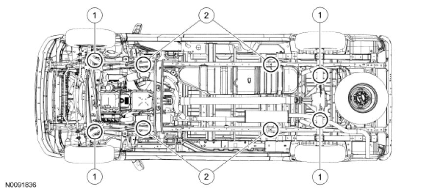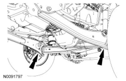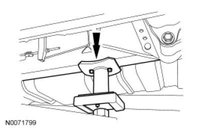 NOTICE: Damage to suspension, exhaust and steering linkage components can occur if care is not exercised when positioning the hoist adapters prior to lifting the vehicle.
