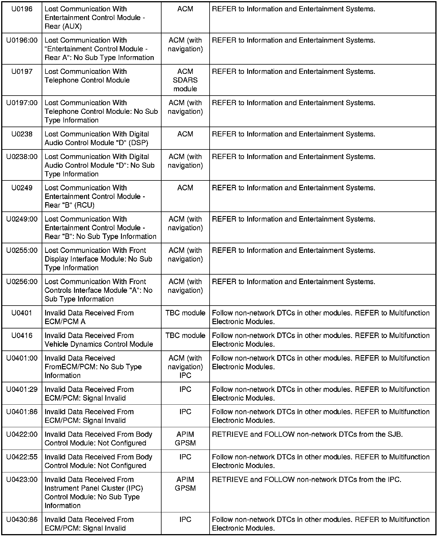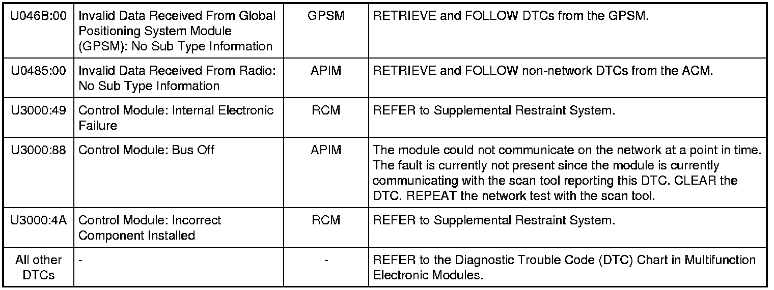 NOTE: Network DTCs (U-codes) are often a result of intermittent concerns such as faulty wiring or low battery voltage occurrences. Additionally, vehicle service procedures such as module reprogramming will often set network DTCs. Replacing a module to resolve a network DTC is unlikely to resolve the concern. To prevent repeat network DTC concerns, inspect all network wiring, especially connectors. Test the vehicle battery, refer to Battery, Mounting and Cables Testing and Inspection.