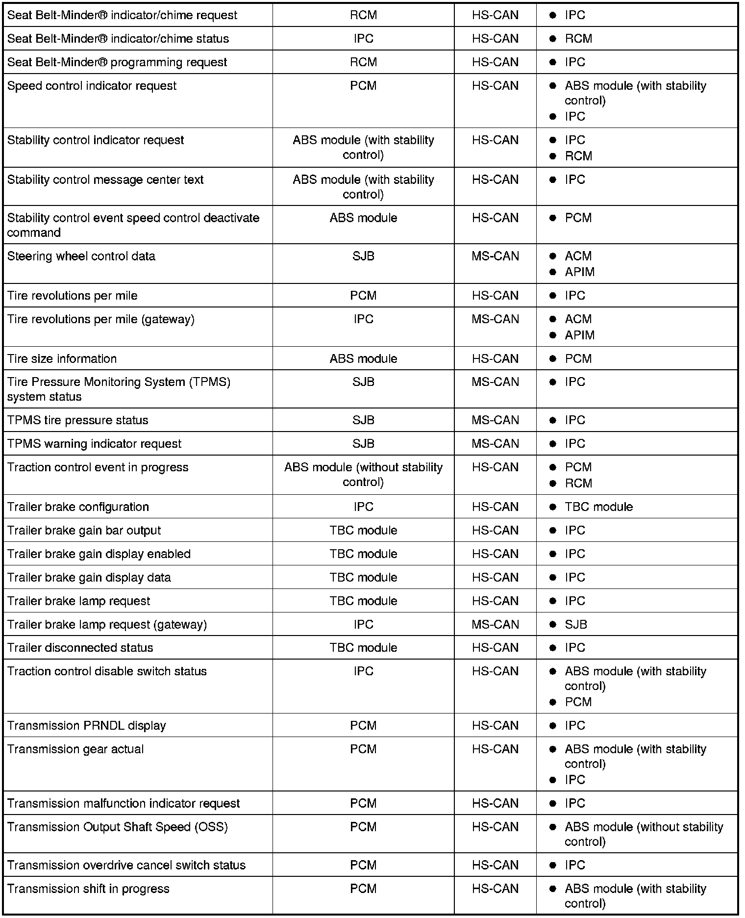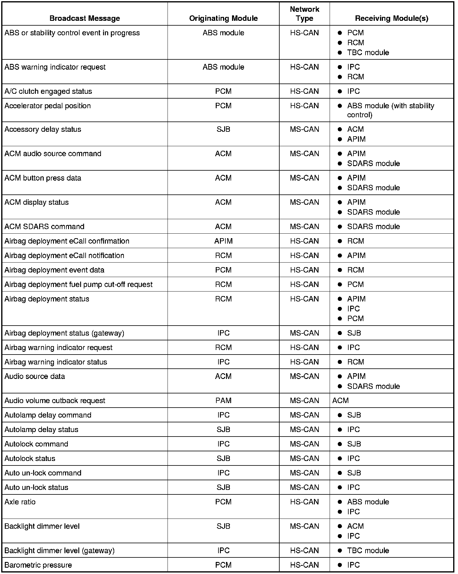 Modules on the CAN utilize simultaneous communication of two or more messages on the same network circuits. The following chart summarizes the messages sent and received on the network.