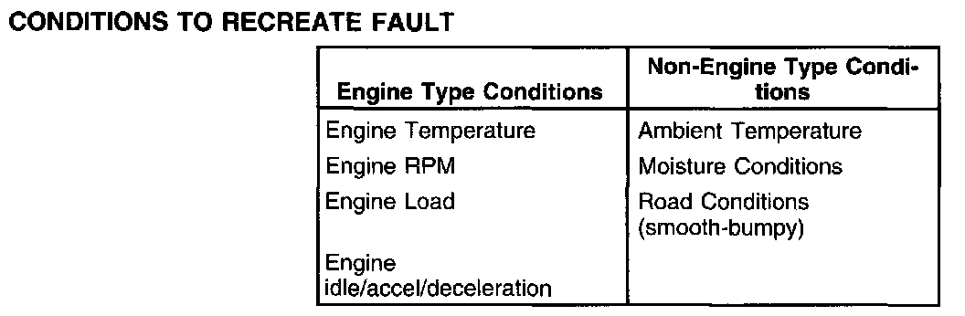 Recreating the concern is the first step in isolating the cause of the intermittent symptom. A thorough investigation should start with the customer information worksheet. If freeze frame data is available, it may help in recreating the conditions at the time of a malfunction indicator lamp diagnostic trouble code (MIL DTC). Listed below are some of the conditions for recreating the concern: