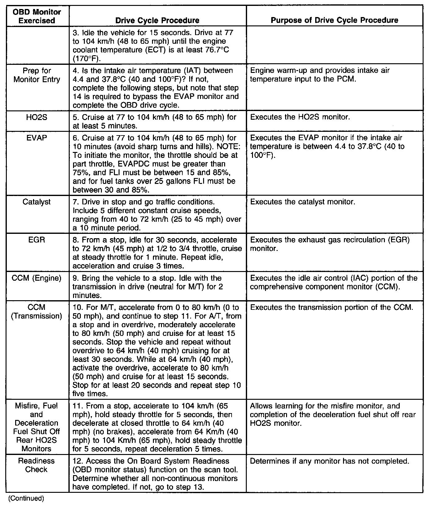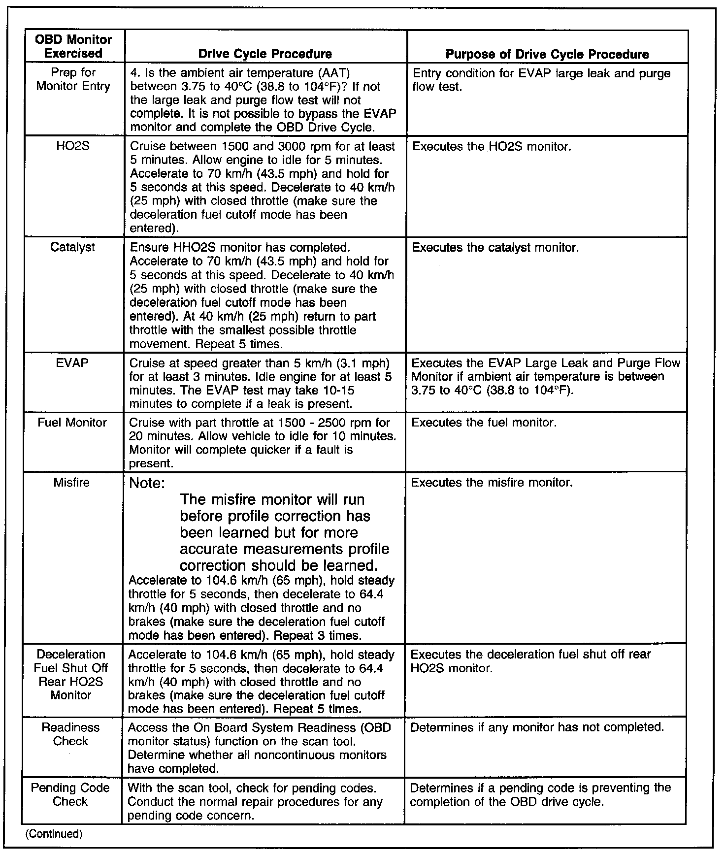 The following procedure is designed to execute and complete the OBD monitors. To complete a specific monitor for repair verification, follow steps 1 through 4, then continue with the step described by the appropriate monitor found under the OBD Monitor Exercised column. For the evaporative emissions (EVAP) monitor to run, the ambient air temperature must be between 3.75 to 40°C (38.8 to 104°F), and the altitude below 2,438 meters (8,000 feet).