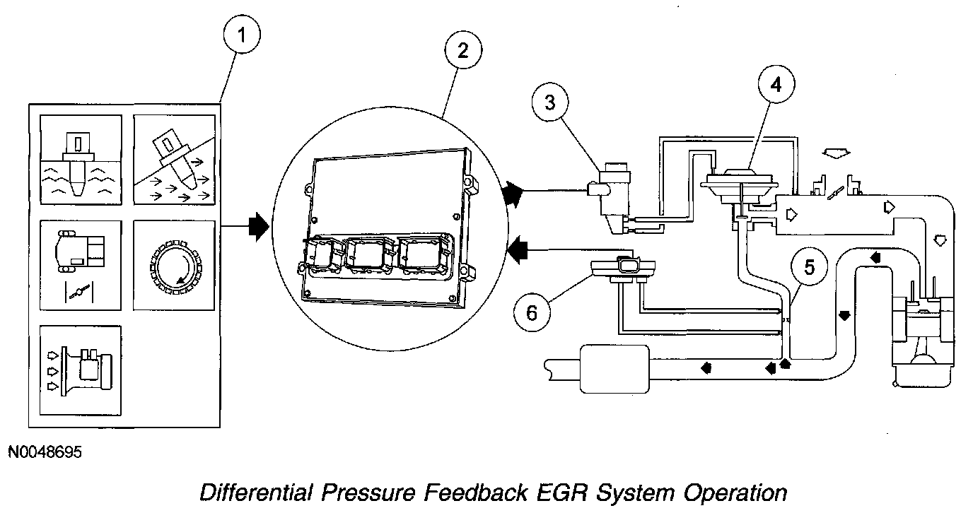 6. The differential pressure feedback EGR sensor measures the actual pressure drop across the metering orifice and relays a proportional voltage signal (0 to 5 volts) to the PCM. The PCM uses this feedback signal to correct for any errors in achieving the desired EGR flow.