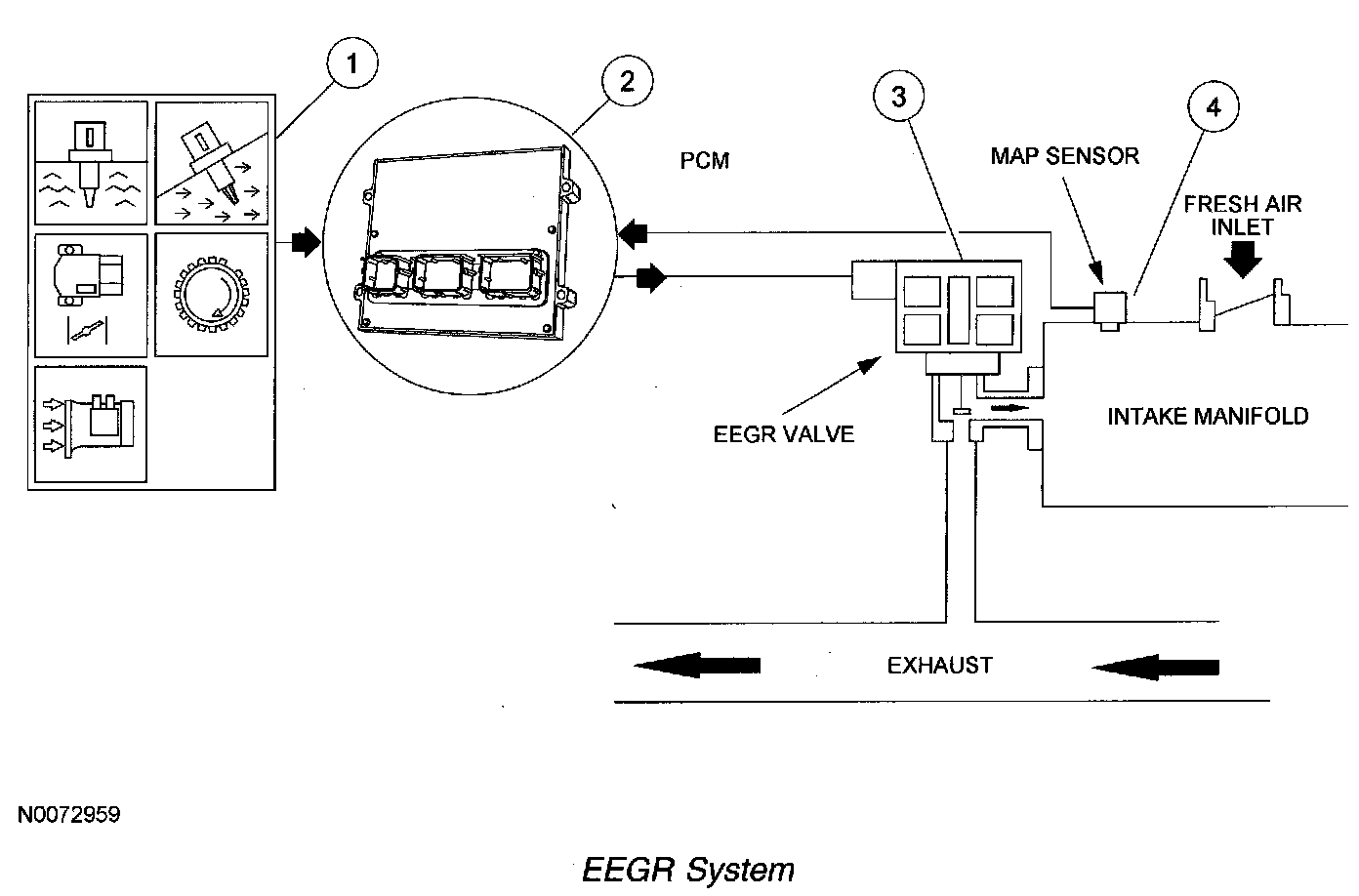 The EEGR system consists of an electric motor/EGR valve integrated assembly, a PCM, and connecting wiring. Additionally a manifold absolute pressure (MAP) sensor is also required. For additional information on the EGR system components, refer to Engine Control Components. Operation of the system is as follows: