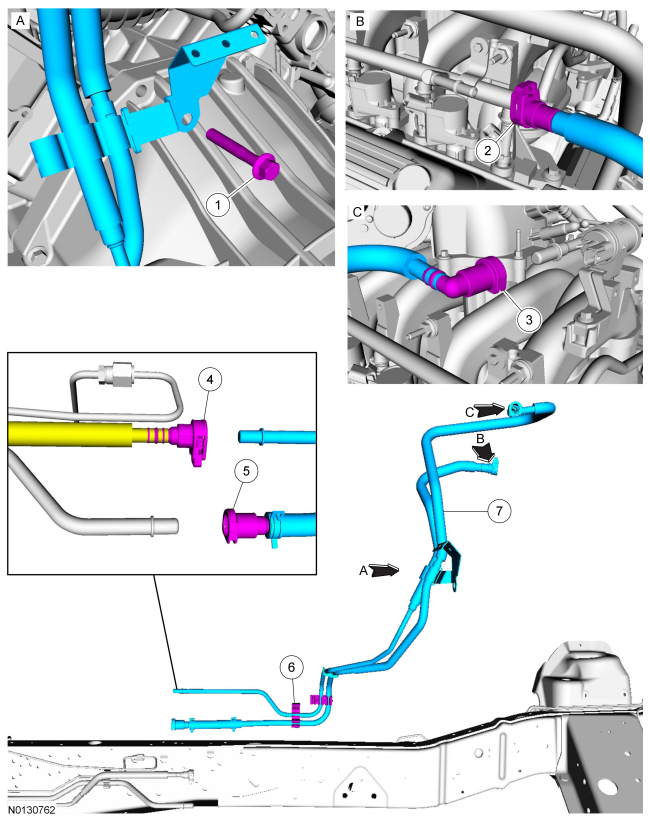 4. Disconnect the front fuel vapor tube-to-Evaporative Emission (EVAP) canister purge valve quick connect coupling. For additional information, refer to fuel delivery and air induction.