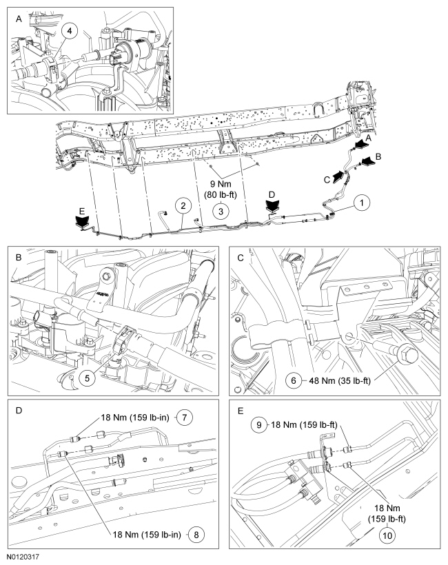 7. - Center brake tube-to-front brake tube fitting - 18 Nm (159 lb-in) (part of 9L291)