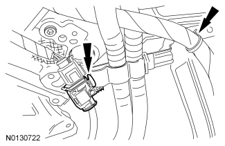 5. Detach the Heated Oxygen Sensor (HO2S) electrical connector retainer and the wiring harness retainer from the fuel supply tube and fuel vapor tube bracket.