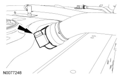 Remove the fuel tank filler pipe hose at the fuel tank-to-fuel tank filler pipe hose connection. Loosen the clamp and disconnect the fuel tank filler pipe hose.