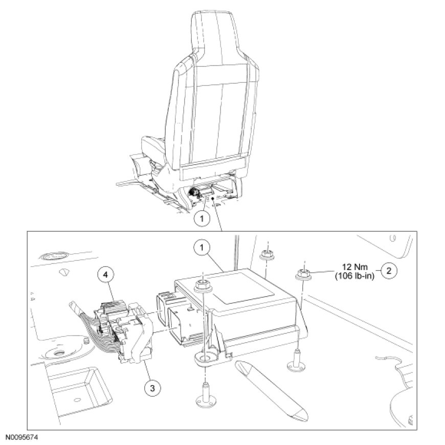 1. WARNING: Always tighten the fasteners of the restraints control module (RCM) and impact sensor (if equipped) to the specified torque. Failure to do so may result in incorrect restraint system operation, which increases the risk of personal injury or death in a crash.