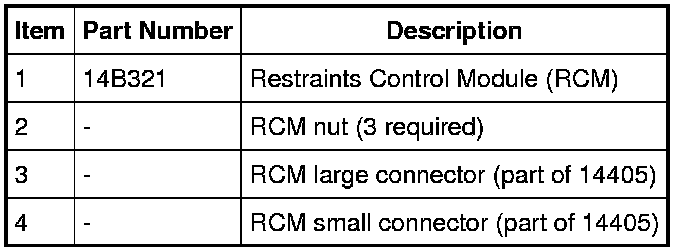 NOTICE: When installing a new Restraints Control Module (RCM), it is necessary to carry out Programmable Module Installation (PMI). System failure may occur if PMI is not performed. For additional information, refer to Module Configuration Programmable Module Installation (PMI).