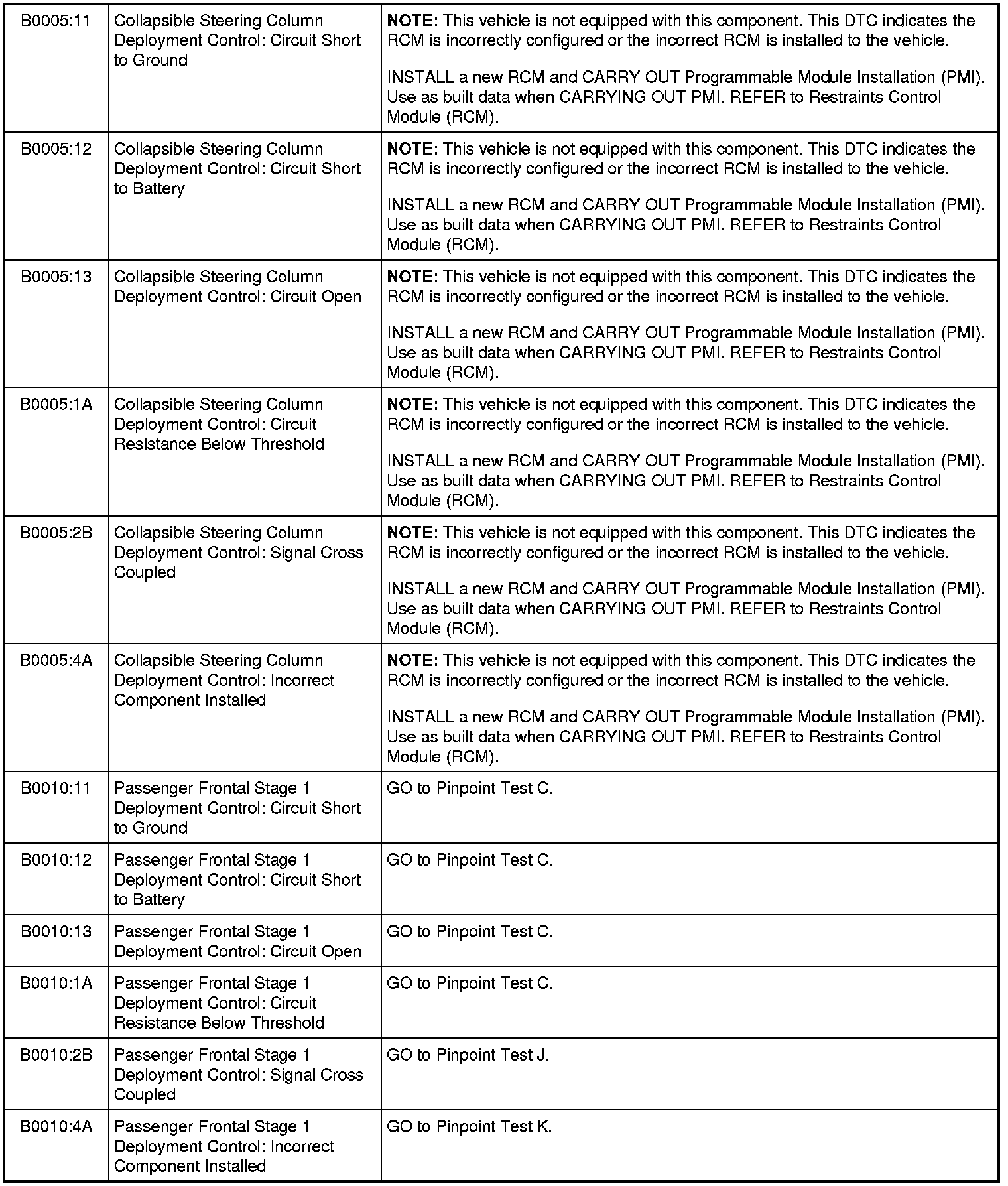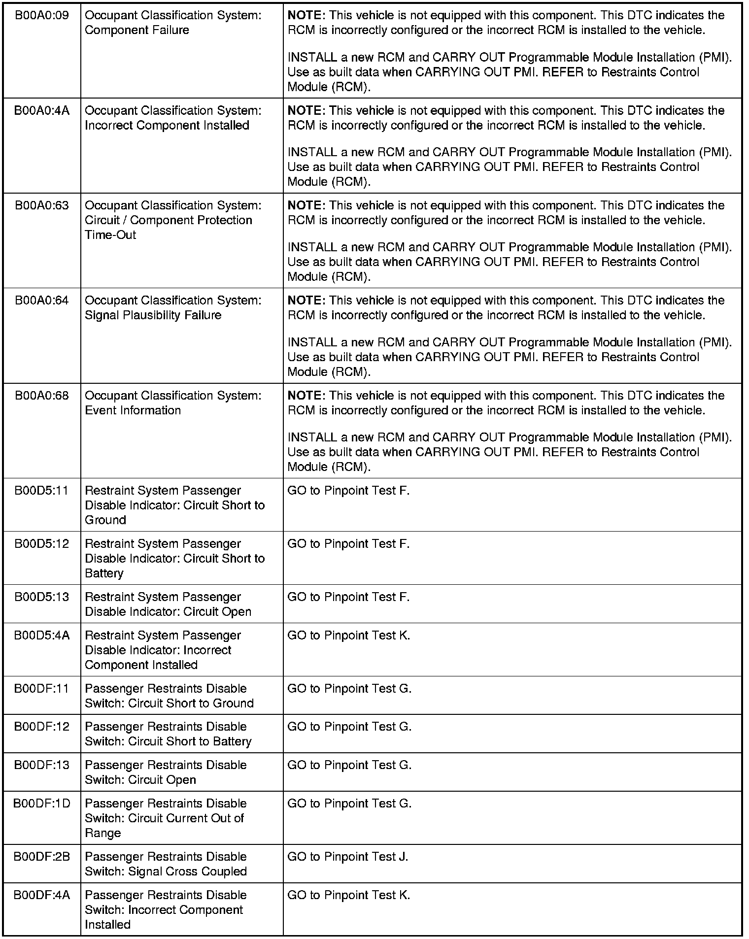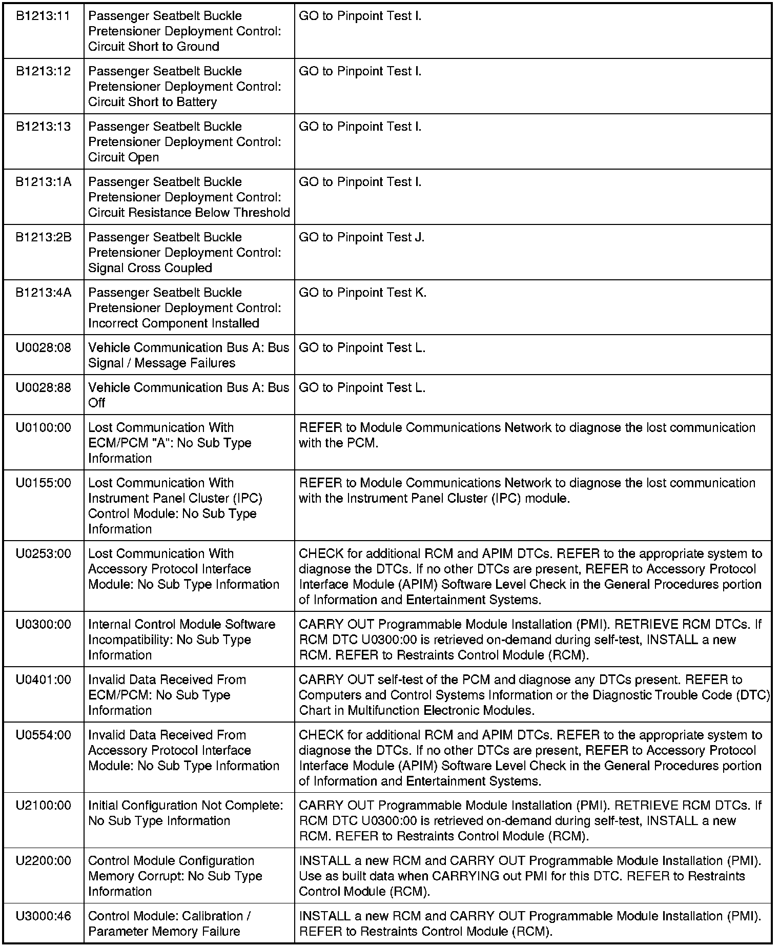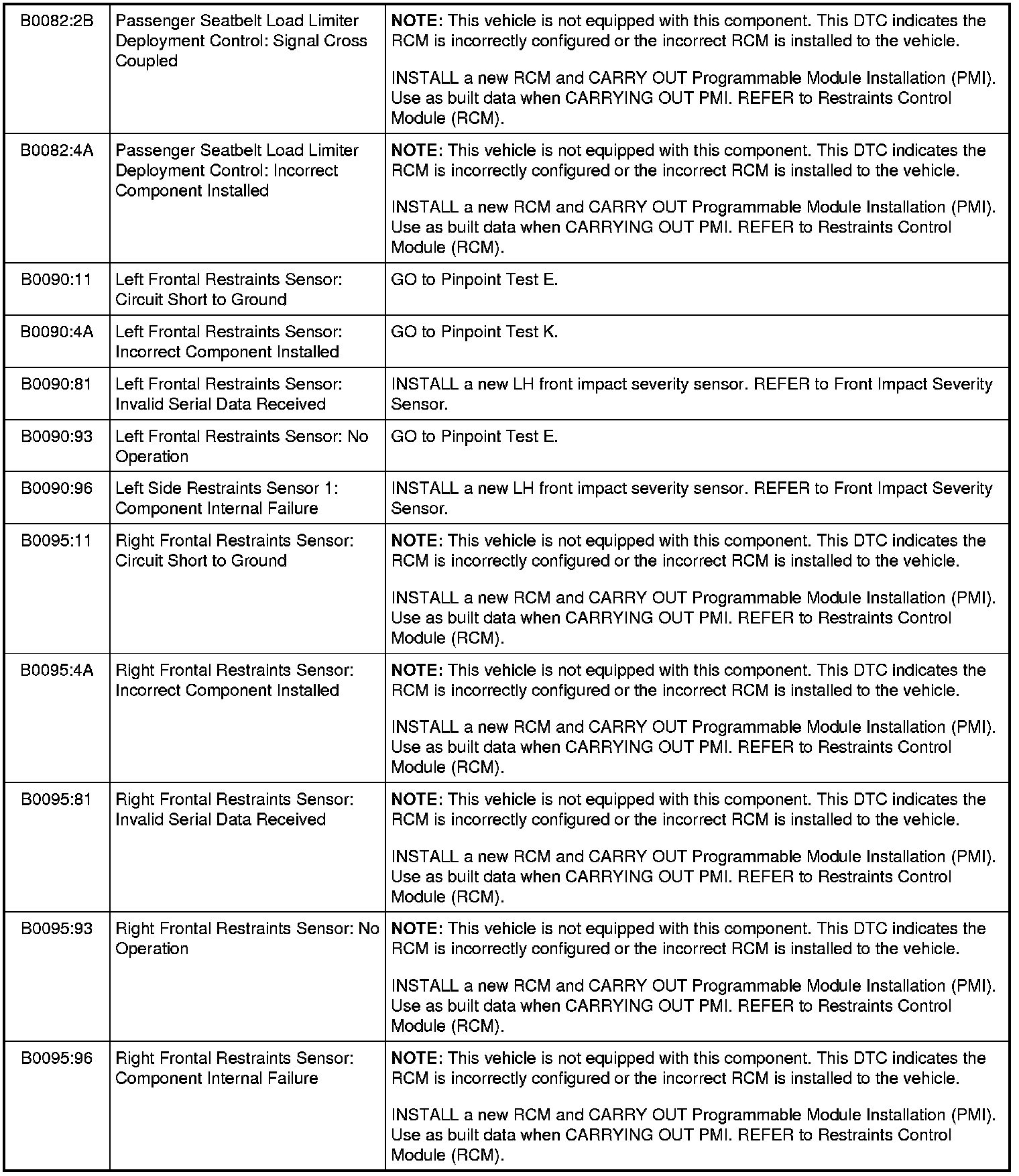 Restraints Control Module (RCM) DTC Chart