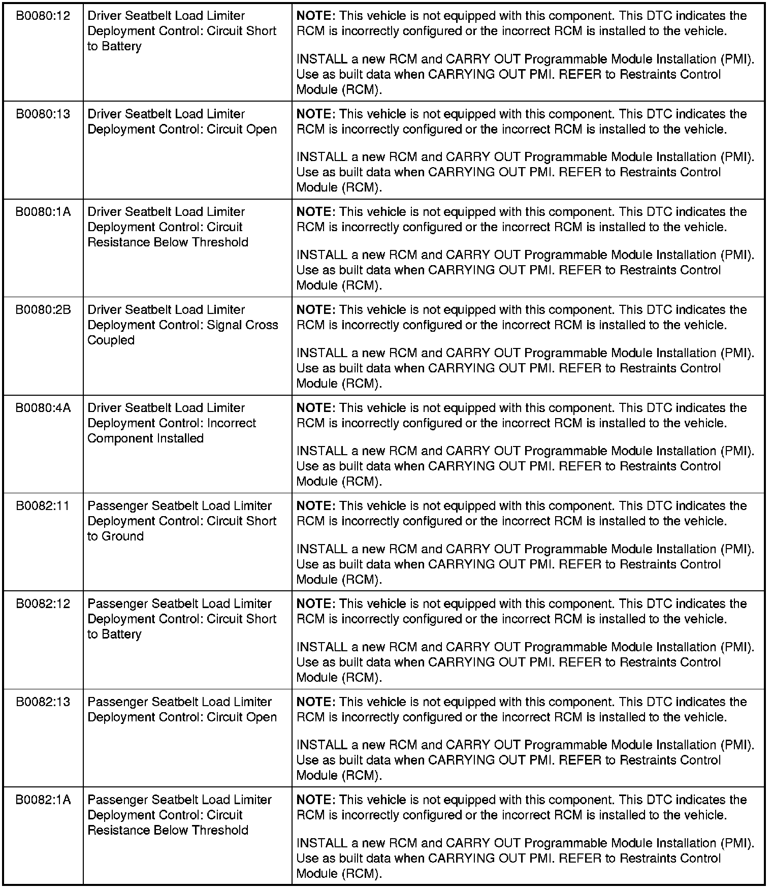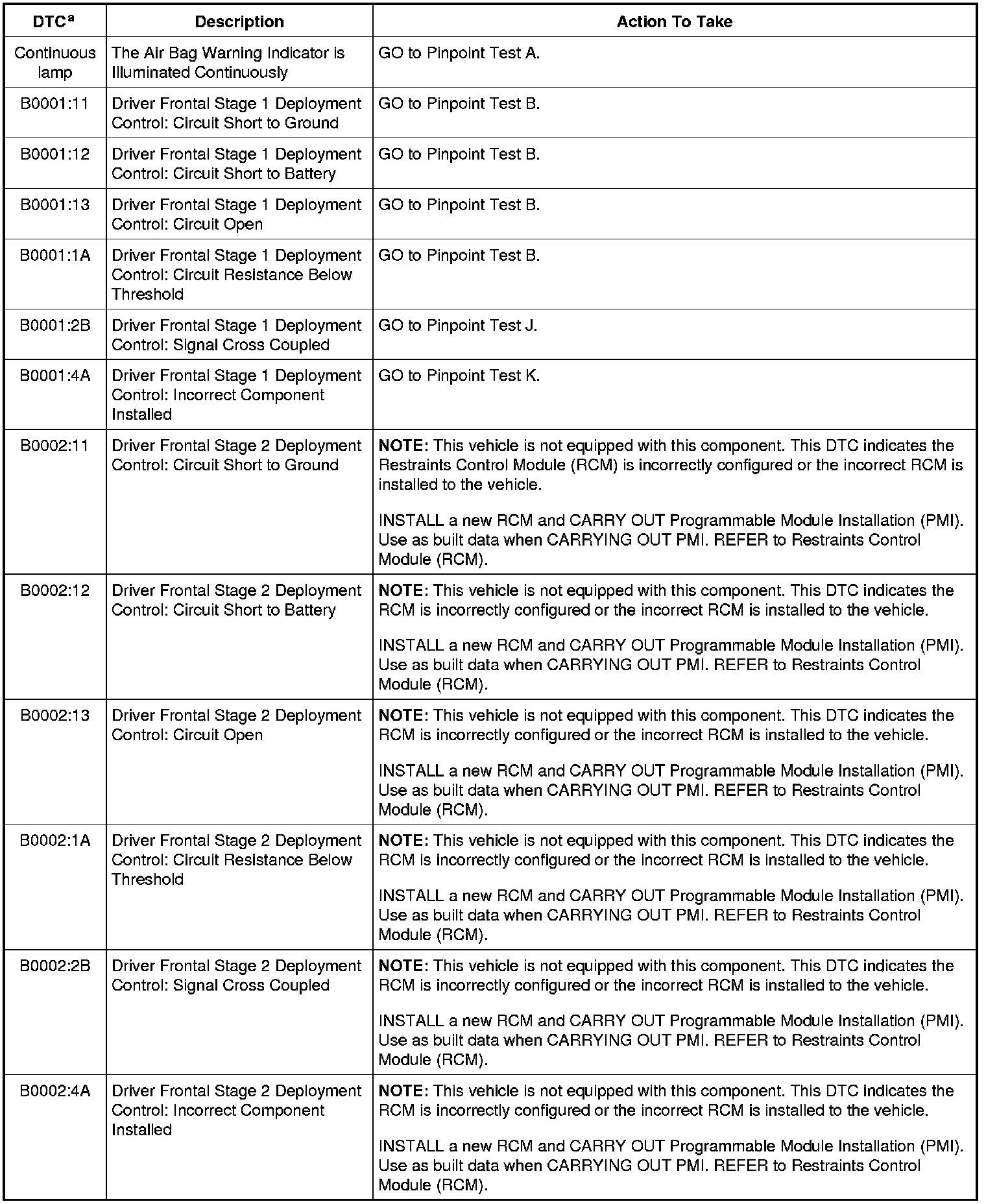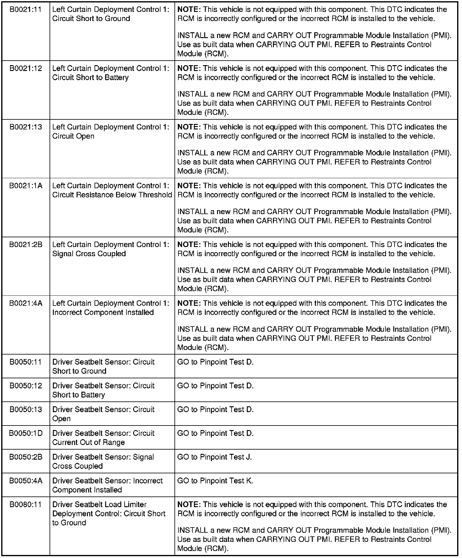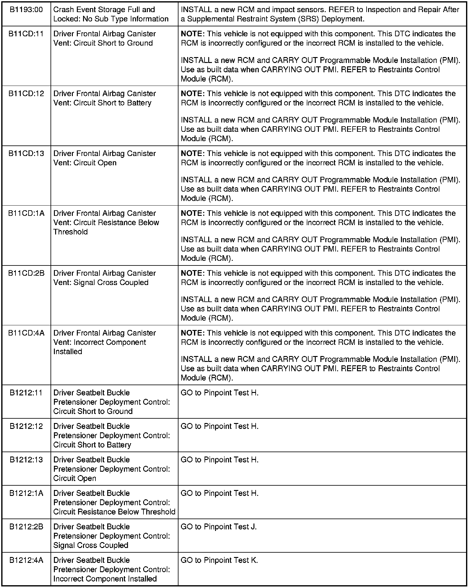 Restraints Control Module (RCM) DTC Chart