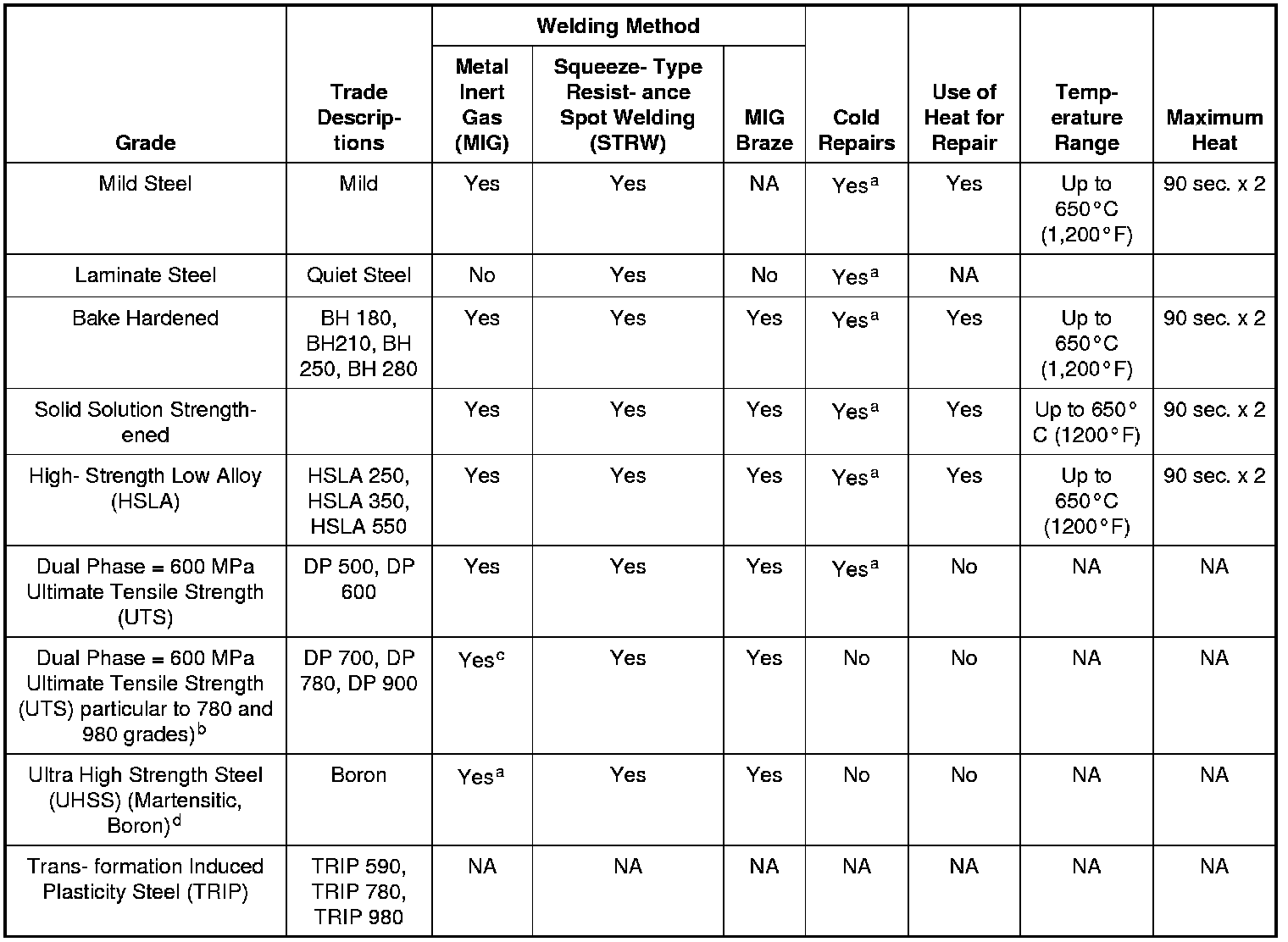 b Dual phase steels DP 700, DP 780 and DP 980 must be replaced at factory joints, no sectioning unless approved procedure in information