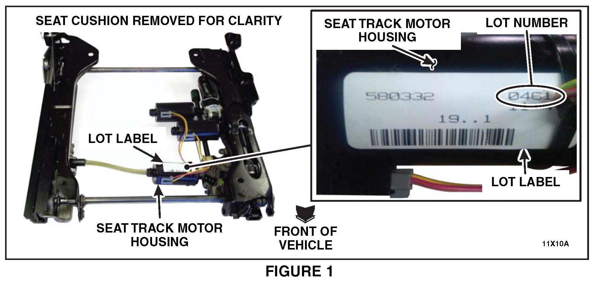 3. Locate the lot label on the top of the seat track motor housing, beneath the seat cushion. Using an inspection mirror, locate and record the seat track motor 4-digit lot number. See Figure 1.