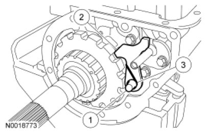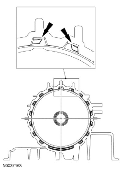 Install a new flat snap ring so the tang ends are in the gaps to the right and to the left of the case spline as shown.