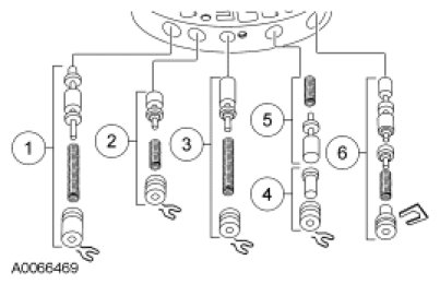 6. Remove the retainer clip with a small magnet or pliers, then remove the converter clutch control plug with shuttle valve, spring retainer and valve.