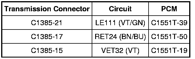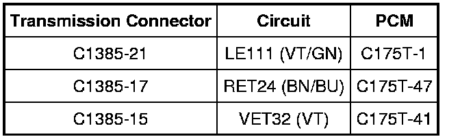 - For 5.4L engines, measure the resistance between transmission vehicle harness C1385 and PCM C175T using the following chart.