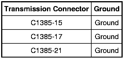 - Measure the resistance between transmission internal harness C1385 and ground component side using the following chart.
