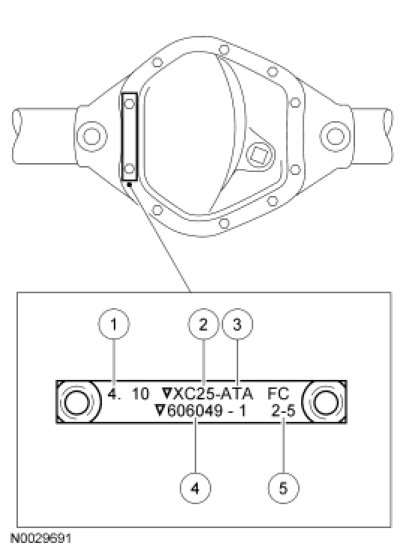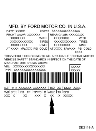 The Vehicle Certification (VC) label is located in the driver door jamb. The axle code is on the VC label. For information on the VC label, refer to Identification Codes Application and ID to cross reference the axle code to the ratio.