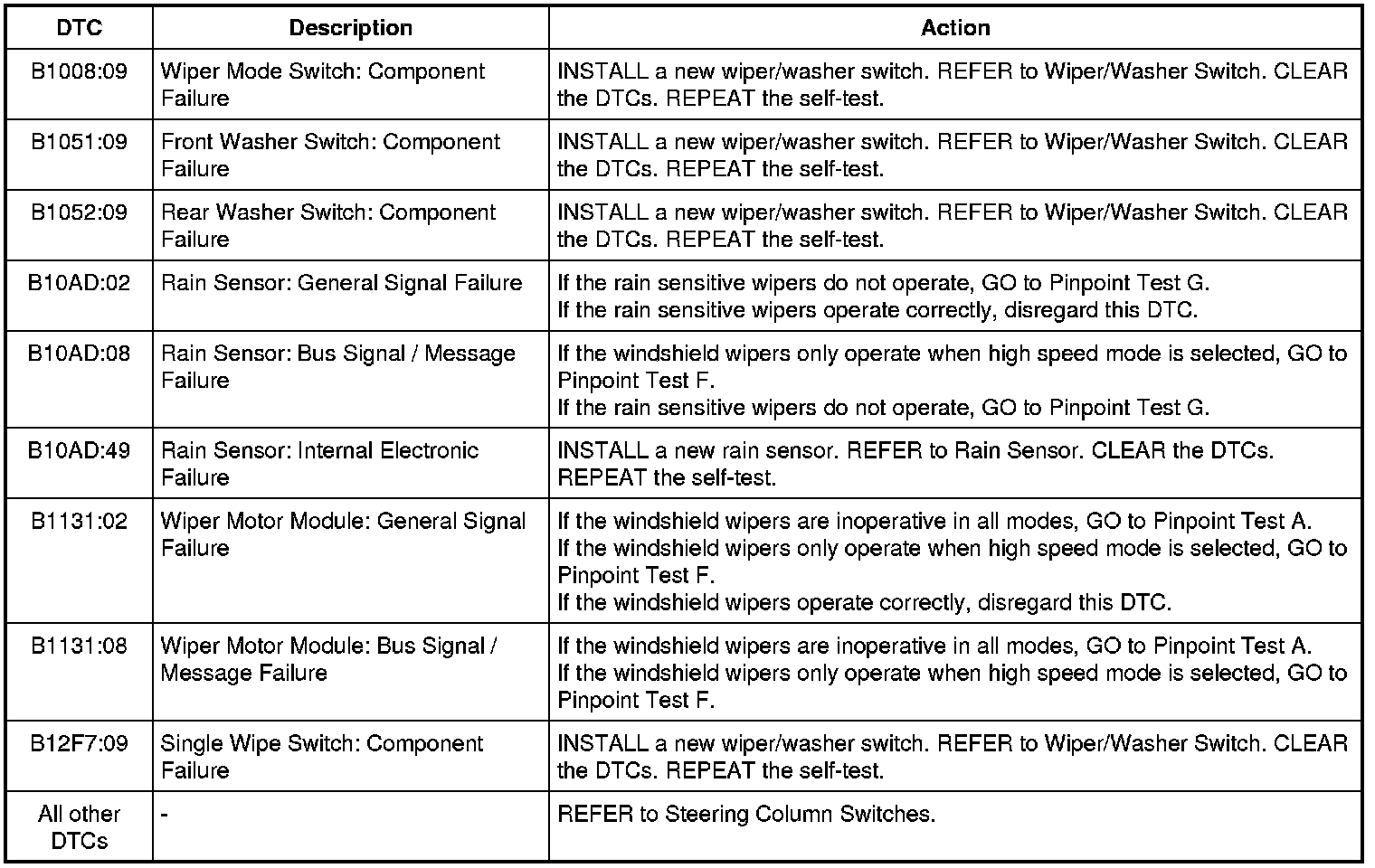 Steering Column Control Module (SCCM) DTC Chart