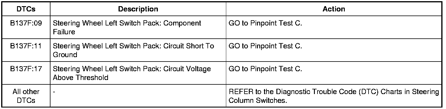 NOTE: This module utilizes a 5-character DTC followed by a 2-character failure-type code. The failure-type code provides information about specific fault conditions such as opens, or shorts to ground. Continuous memory DTCs have an additional 2-character DTC status code suffix to assist in determining DTC history.