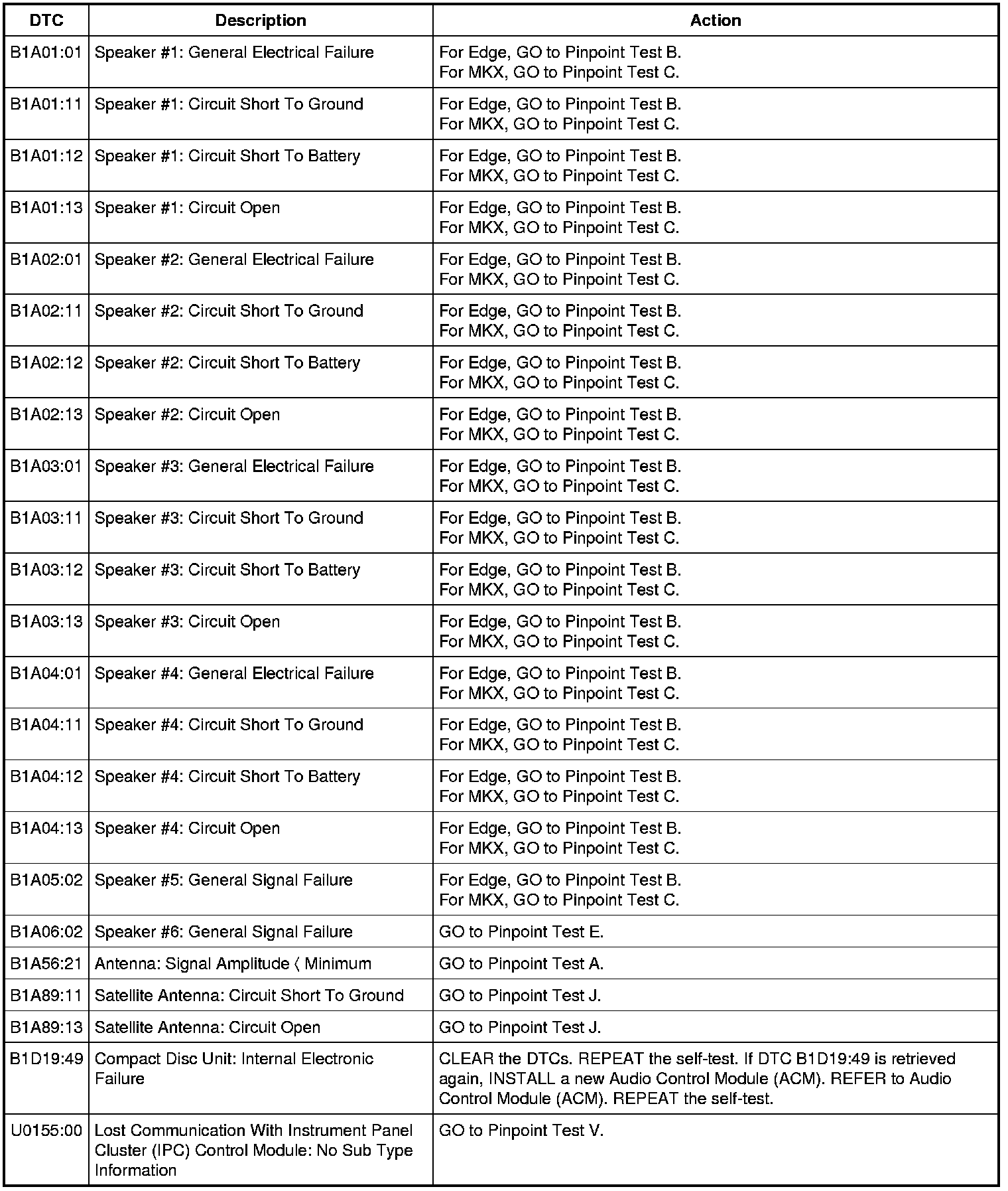 NOTE: All audio modules utilize 5-character DTCs followed by a 2-character failure-type codes. The failure-type code provides information about specific fault conditions such as opens or shorts to ground. Continuous memory DTCs have an additional 2-character DTC status code suffix to assist in determining DTC history.