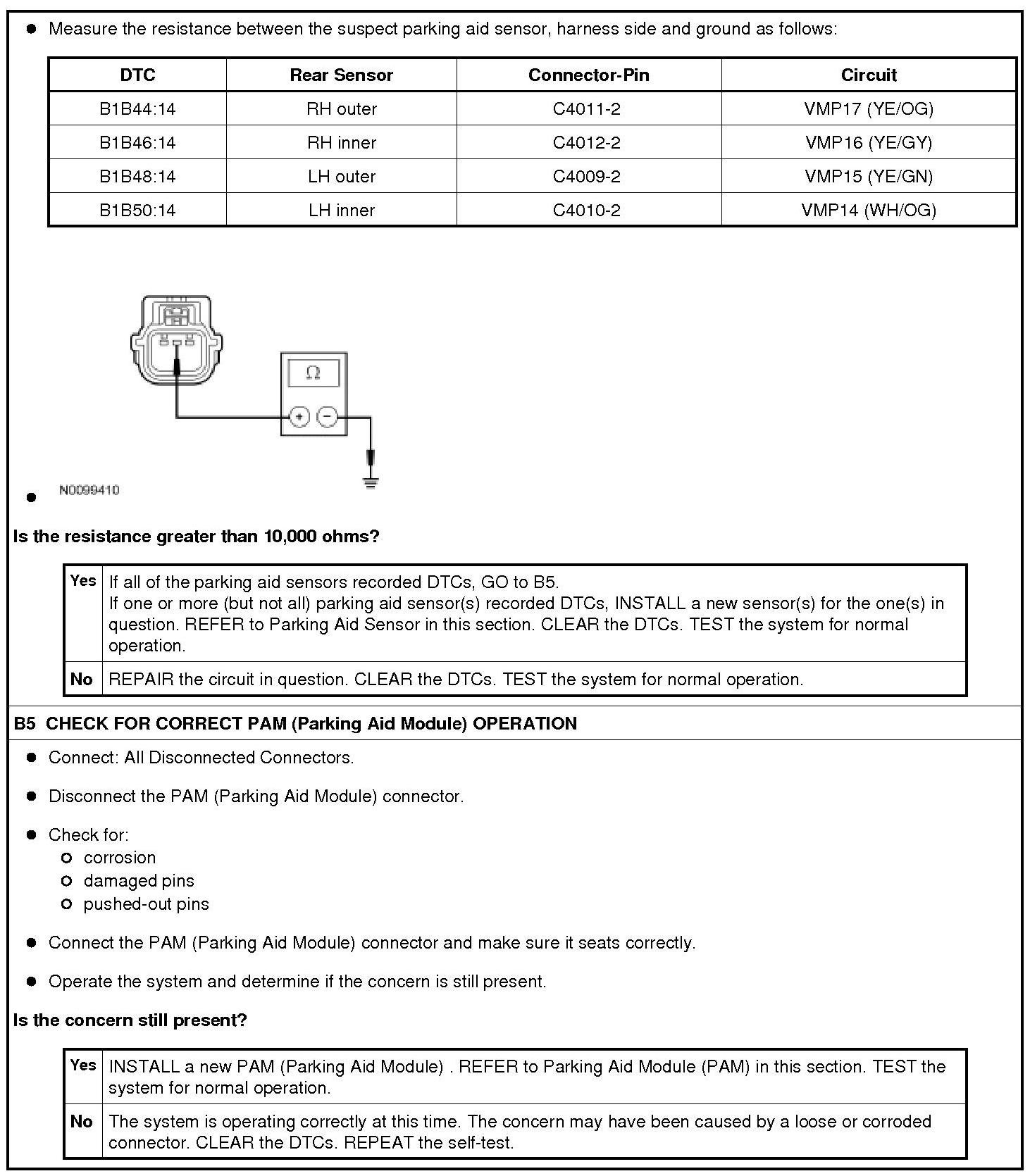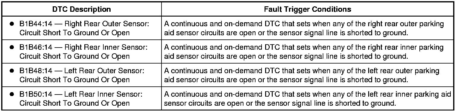 The Parking Aid Module (PAM) supplies a reference voltage and signal return to the parking aid sensors. A fault condition occurs when the PAM (Parking Aid Module) detects an open in the parking aid sensor circuits between the Parking Aid Module (PAM) and the sensor or if the parking aid sensor input signal circuit is open or shorted to ground.