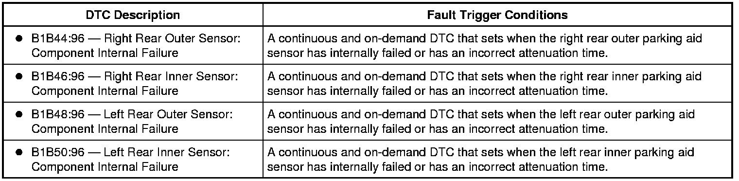 The attenuation time for the rear parking aid sensors is the time required for a sensor to detect the distance to an object expressed in milliseconds (ms). A fault condition occurs when the signal or the attenuation time is out of normal range.