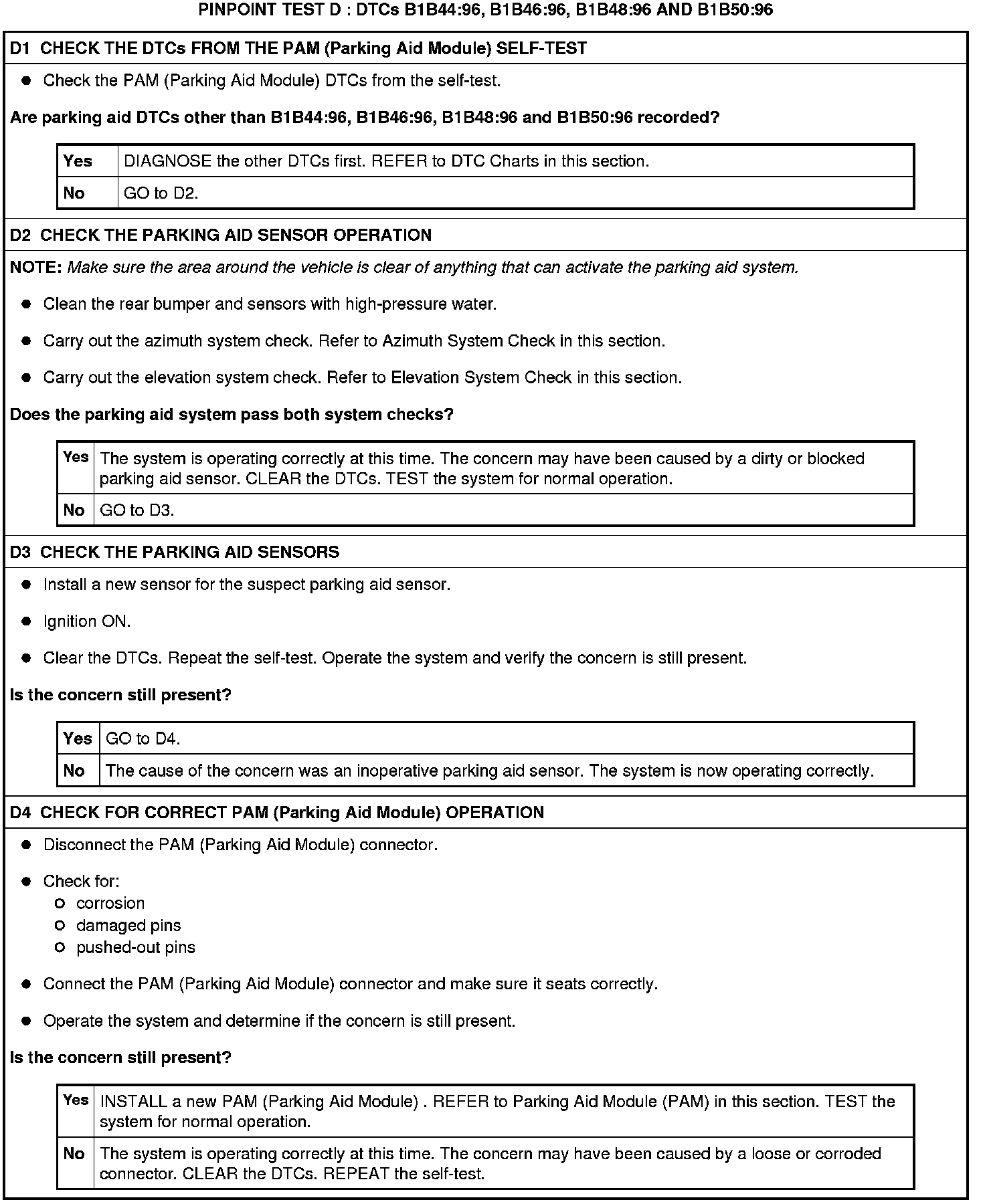 Pinpoint Test D: DTCs B1B44:96, B1B46:96, B1B48:96 and B1B50:96